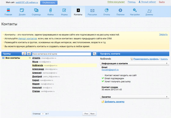 Помимо базовой страницы, на которой можно размещать все от текстов и фотографий до онлайн-видео и скриптов, в конструкторе сайтов Redham есть и дополнительные типы страниц: